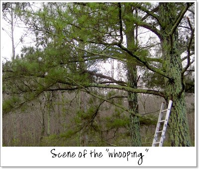 Karen explained to me that she had let both cats out earlier in the evening. It's not unusual for the cats to make their nightly rounds and return home around mid-night. My wife recalled to me that at 2:00 am in the morning she heard a huge cat fight out back and immediately went downstairs to investigate. She whistled for the cats and our large cat Sandy came running inside...but no sign of Kitten-Little (Simon). The night had been cold and rainy. I put my tool bag and lunch bag down and immediately went outside to search for our little runt, Kitten-Little. I walked around the backyard whistling for the cat and stopping to listen for a response...nothing. After circling the backyard I came to the front of the house and went down the driveway looking for our precious little rescue cat. I wondered to myself if this little runt had the necessary skills to survive on his own if he was indeed lost or hurt. I stepped back into the house just in time to hear my wife call to me that she heard him. I walked out back and tried to hear what she heard but no luck. I looked under the house in the crawl-space and under the screened sun-porch....no Kitten-Little. My wife went back to the house to tend to her breakfast meal and I stayed out back. Then the epiphany...what if the cat had climbed a tree? Cats do climb trees right? I glanced around at our many trees but quickly drew my focus to the tree which connects with my deer-stand. Sure enough, almost 12 feet in the air and at the very end of a thick branch was Kitten-Little; a cold soggy, scared image of a kitten.